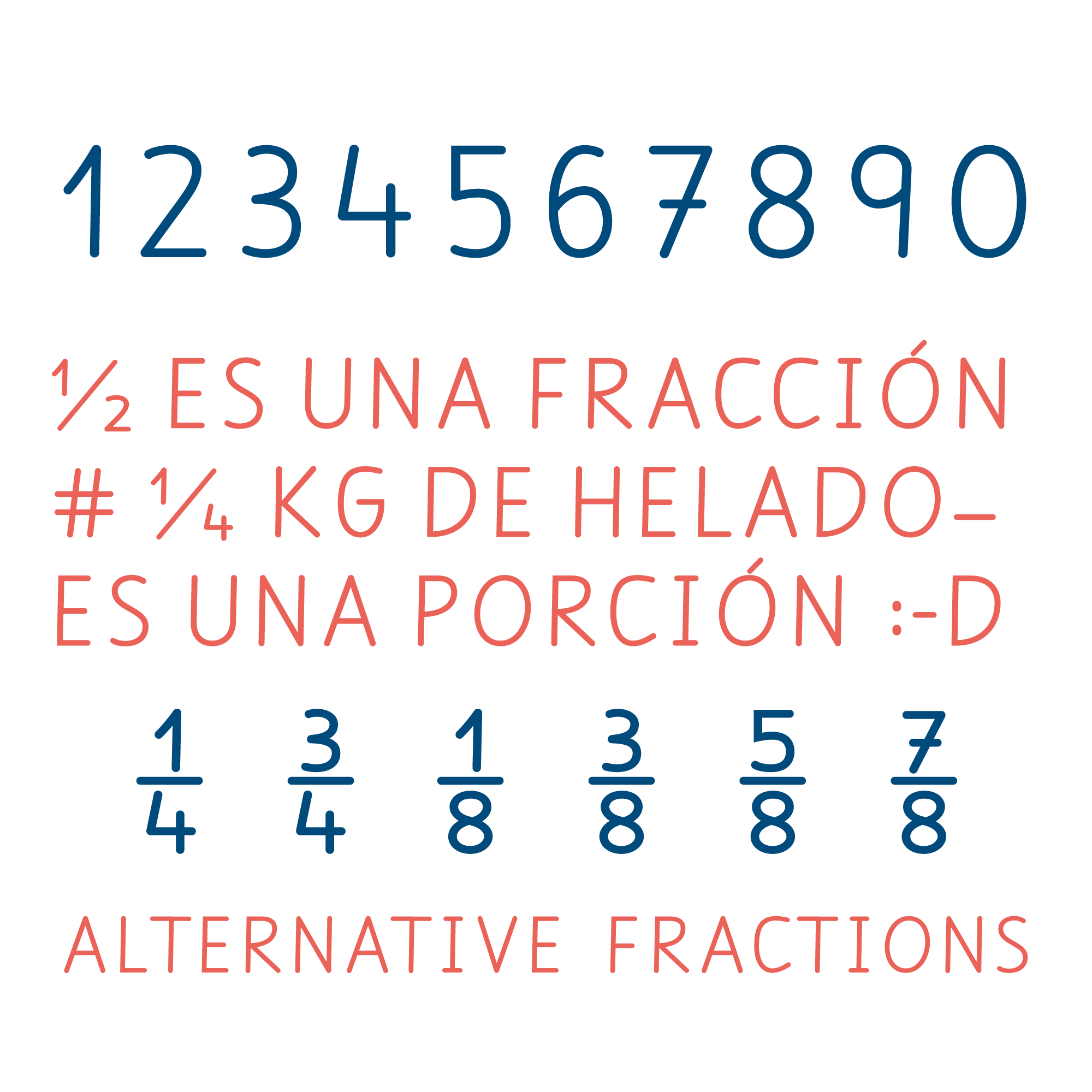2 • Simplified functionality. Designed so that teachers or people unfamiliar with design programs can self-edit educational worksheets or pedagogical material using tools like LibreOffice, Notepad, TextEdit, Microsoft Office, etc. The OpenType development is structured with contextual alternates, following the model proposed by Rosalie Wagner, which ensures compatibility with these tools.